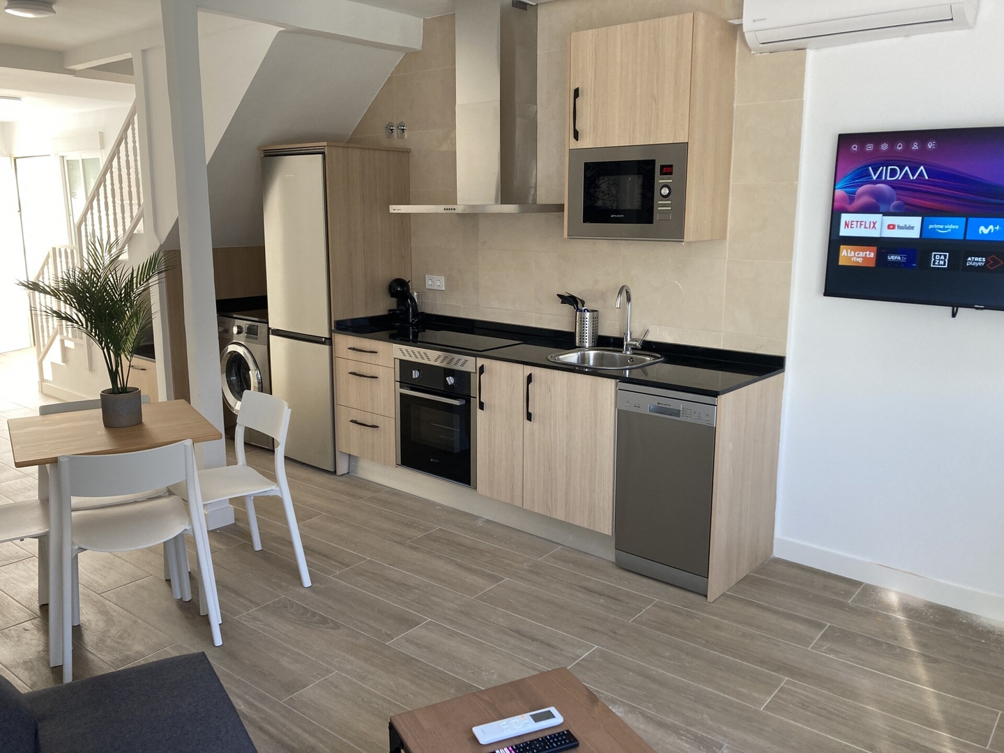 Dispone de lavadora, plancha, acceso internet (wifi), secador, calefacción bomba de calor, aire acondicionado, Televisión.